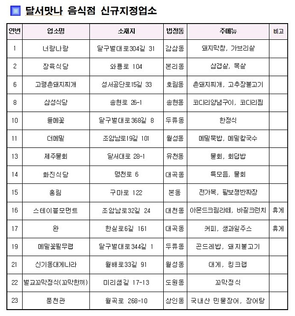 이번에 새롭게 달서맛나 음식점으로 선정된 업소는 ‘너랑나랑’, ‘장육식당’, ‘고령촌돼지찌개’, ‘삼성식당’, ‘들메꽃’, ‘더메밀’, ‘제주물회’, ‘화진식당’, ‘홍림’, ‘메밀꽃필 무렵’, ‘신기동대게나라’, ‘벌교꼬막정식’, ‘풍천관’ 일반음식점 13개소와 ‘스테이블모먼트’, ‘완’ 휴게음식점 2개소이다.