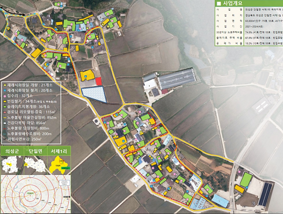 두 개 마을의 안전 확보를 위해 △마을안길 확장 △노후 배수로 정비 △재래식화장실 철거 및 개량 △마을CCTV 설치 △ 안전방송시스템 설치 △위험사면 보강 등을 진행할 예정이며 슬레이트 지붕 철거 및 개량, 빈집철거, 노후 집수리 등 주택정비도 진행할 예정이다.