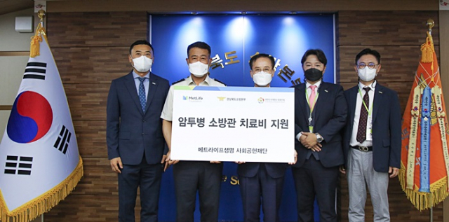 경북소방본부는 5일 경북도청 119작전회의실에서 메트라이프 사회공헌재단으로부터 암 투병 중인 소방공무원을 위한 치료비 1000만 원 전달식을 가졌다고 밝혔다.