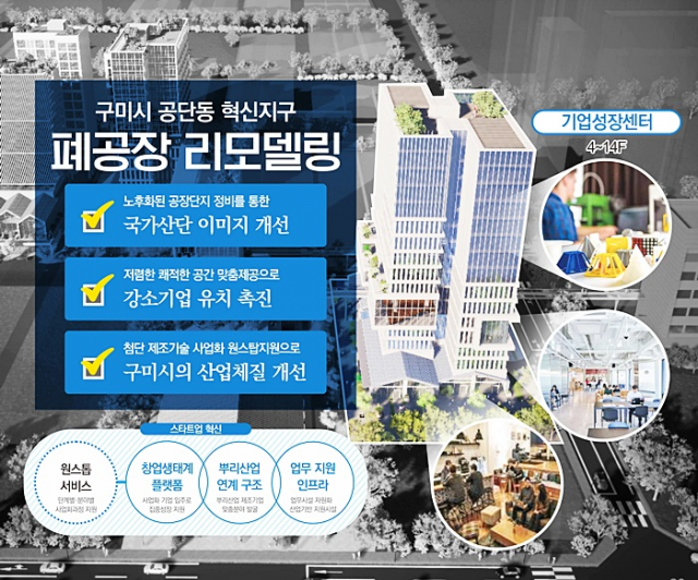 구미시는 공단 도시재생혁신지구 사업부지 일부에(공단동 249번지) 조성 예정인 신성장 스타트업 기업의 발굴·육성부터 단계별 혁신 및 성장을 지원할 기업성장센터와 근로자 문화·복지·편의시설이 복합된 공간조성 계획에 대하여 한국산업단지공단의 심사평가를 받아 최종 선정되었다.