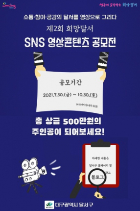 ‘제2회 희망달서 SNS 영상콘텐츠 공모전'은 과거와 현재, 또는 미래의 달서구 모습, 주요 정책(일자리, 아동친화, 친환경, 스마트도시 등), 달서구와 관련한 감동 사연이나 재미있는 경험담, 달서구민의 모습과 생활상 등의 콘텐츠를 공모한다.