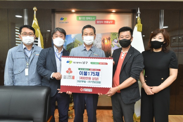 대구광역시 남구청(구청장 조재구)은 지난 10일, DGB캐피탈(대표 서정동)과 ㈜자연공간산업(대표 김응초)에서 어려운 이웃을 위해 이불 175채(400만 원 상당)를 기탁했다고 밝혔다.