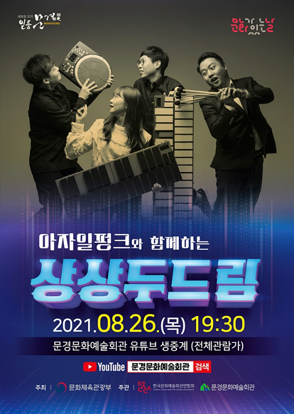 2021년 문화가 있는 날 사업으로 ‘아자일펑크와 함께하는 상상두드림’ 공연이 8월 26일(목) 저녁 7시 30분에 유튜브 채널 「문경문화예술회관」에서 실시간 생중계된다.