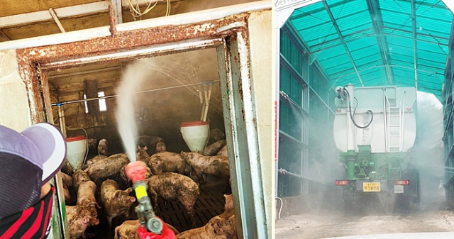 | ↑↑ 아프리카돼지열병 차단방역에 안간힘, 돈사내부소독(좌) 차량소독(우) |