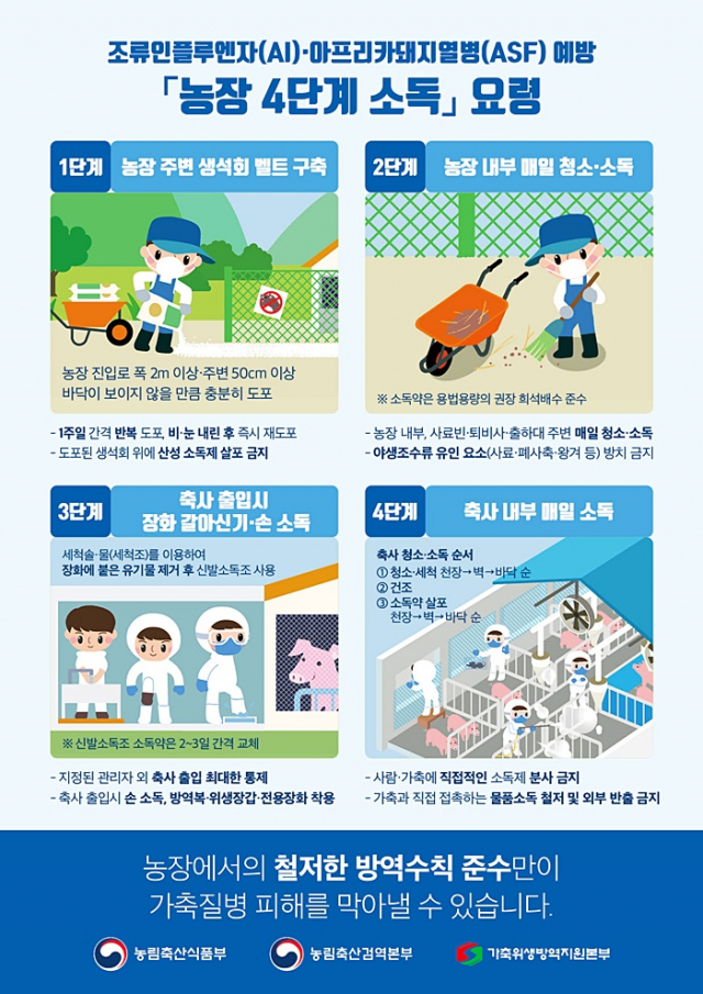 이와 관련하여, 안동시는 상반기에 1억8천만 원(보조 60%)을 지원하여 울타리 등 기본 방역시설을 강화하도록 하였으며, 2차례에 걸쳐 생석회 2,000포, 각종 소독약품 4,000kg과 방역복 900벌을 배부한 바 있다.