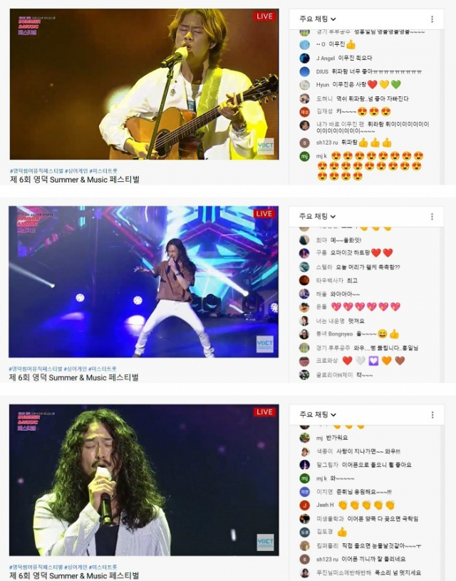 열창하는 가수의 오른쪽 화면 위로 쉴새 없이 채팅메시지가 올라오고 응원 이모티콘이 쏟아진다. “오늘 대한민국에서 가장 부러운 분들은 영덕군민들~! ”,“앰블런스 대기 중인가요? 예근님이 저렇게 멋지게 쳐다보면 관객들 괜찮나요? ” 8월 13일 약 11,146명의 인터넷 유저들이 저녁 7시 30분부터 영덕썸머뮤직페스티벌 유튜브 채널에 접속해 영덕어게인 공연을 즐겼다.