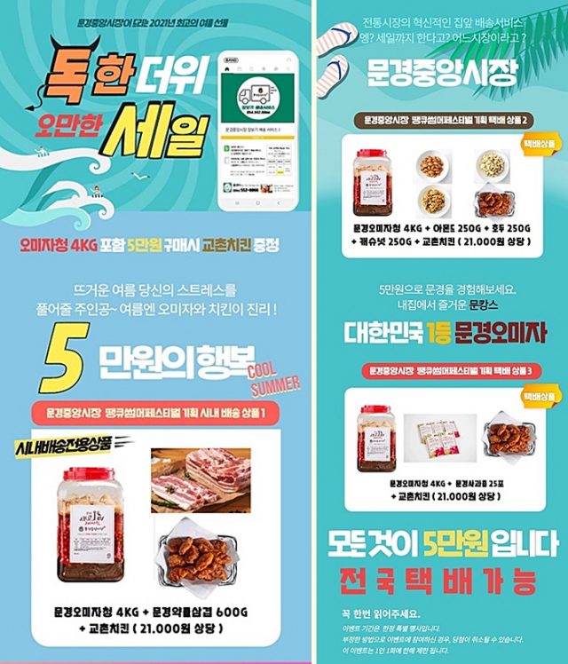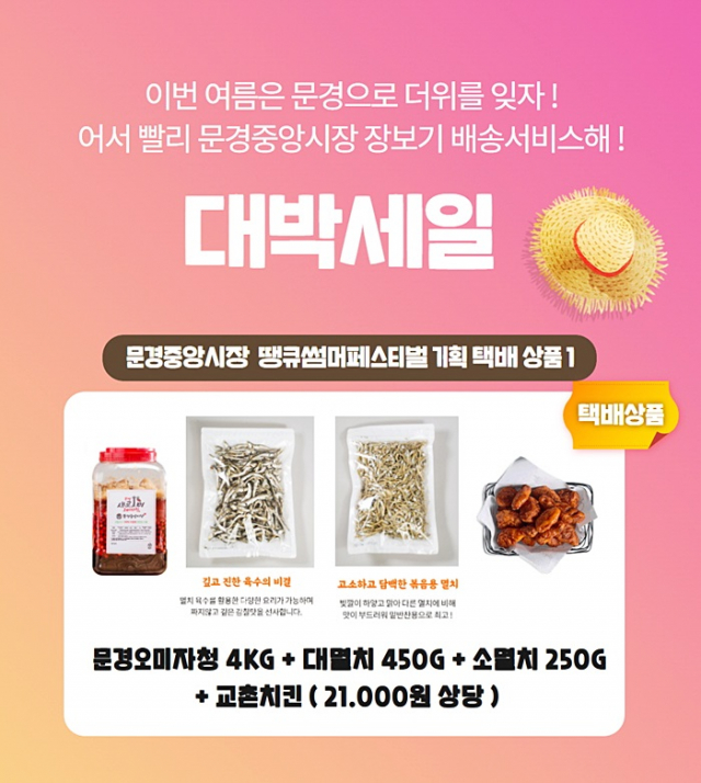 문경시 중앙시장은 8월17일(화)부터 9월17일(금)까지 선착순 600명에게 제공되는 ‘떙큐 썸머 페스티벌 5만원의 행복’비대면 배송서비스 이벤트를 실시한다.