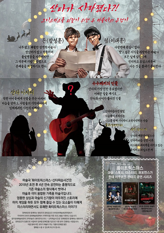 공연은 어느 날 갑자기 피습을 당해 사라진 산타를 찾기 위한 두 마술사의 추적기를 코믹하고 미스터리하게 엮어낸 작품으로 엉뚱한 상상과 마술의 신기함이 어우러져 마치 게임을 하듯 여러 재미 요소들이 더해져 어린이 및 가족들이 함께 즐길 수 있다.
