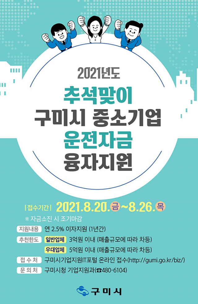 한편 추석맞이 운전자금 신청은 8월 20일부터 8월 26일까지(자금소진 시 조기마감) ‘구미시기업지원IT포털(http://gumi.go.kr/biz/)’로 온라인 신청(비대면)하면 된다.