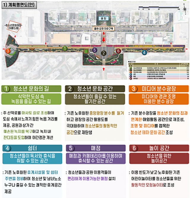 청소년 문화 교류 및 도심 속 휴식공간 제공을 위해 추진하는 이번 사업은 청소년 문화의 길을 비롯해, 청소년 문화 공간, 미디어 분수공장, 쉼터, 매점, 놀이공간 등 6개의 시설이 조성된다.