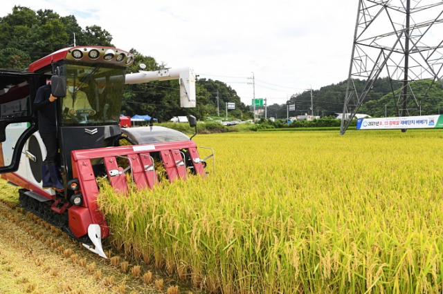 경북 영주서 올해 첫 벼베기 행사가 19일 오전 10시 장수면 반구리 8‧15광복쌀 재배단지(이시욱 농가)에서 열렸다. 이번에 수확한 ‘8·15광복쌀’은 조생종인 해담벼와 진옥벼로 지난 4월 24일 모내기를 한 후 118일 만에 첫 수확이다.