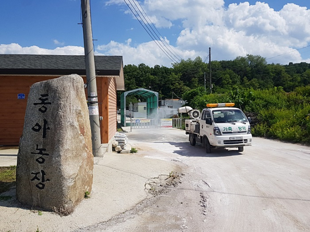 | ↑↑ 방역차량으로 양돈농가(동아농장)주변을 소독하고 있다 |
