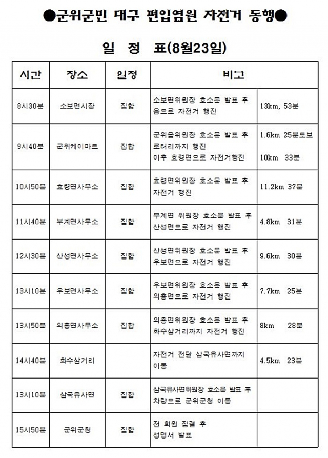 8월23일(월) 오전 8시30분 소보면에서 출발하여 군위군청에 도착예정이며 읍면 추진위원 10~15명이 참여할 예정이며
