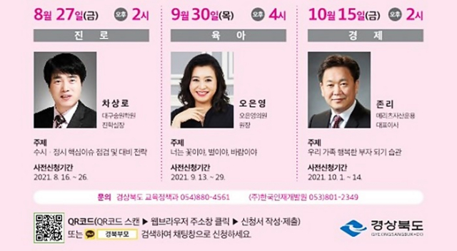첫 번째 명품 부모강좌는 16일부터 26일까지 안내 리플릿에 포함된 QR코드 또는 카카오채널 ‘경북부모’를 검색해 사전 신청할 수 있으며, 관련 문의는 경상북도 교육정책과(☎054-880-4561) 또는 한국인재개발원(☎053-801-2349)으로 하면 된다.