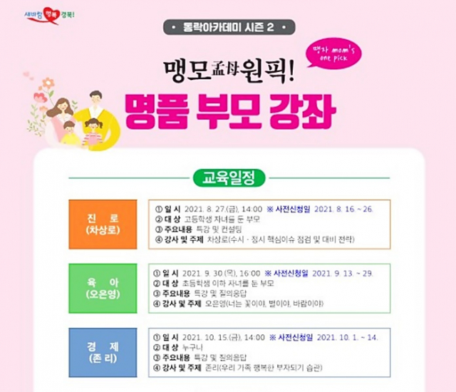 경상북도는 도청 동락관에서 8월부터 10월까지 세 차례에 걸쳐 진로ㆍ육아ㆍ경제 분야 명사를 초청해‘맹모(孟母) 원픽! 명품 부모강좌(이하 강좌)’를 개최한다고 23일 밝혔다.