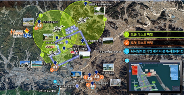 이번 협약은 올해 5월 ‘2021 디지털 물류 서비스 실증사업’이 국토교통부 공모에 선정돼 국비 20억 원을 확보한 가운데 지방비 20억 원 투입해 김천에서 자율운송기인 드론과 로봇을 활용한 물류배송을 실증하기 위해 이뤄진다.