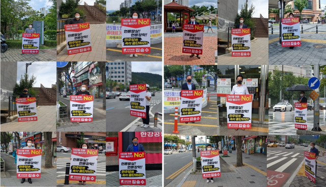 이날 1인 시위는 24일 국회 법사위와 25일 본회의 통과를 앞두고 있는 언중법의 위법성과 위험성을 알려 일반시민들과 언론의 동참을 촉구하고자 김승수 의원이 직접 제안했고 대구 북구을 당협위원들의 적극적인 참여로 이뤄지며 국민의힘 당협 중에서는 가장 먼저 진행됐다.