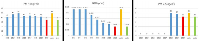 | ↑↑ 대기질 개선(좌로부터 미세먼지 변화추이, 이산화질소 변화추이, 초미세먼지 변화추이) |