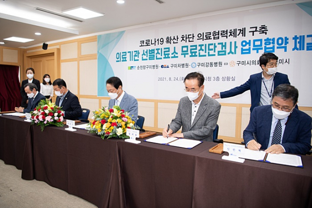 한편, 구미시에서는 8월 24일(화) 14:00, 시청 3층 상황실에서 장세용 구미시장, 김재상 구미시의회 의장, 임한혁 순천향대학교부속 구미병원장, 유완식 CHA의과학대학교부속 구미차병원장, 신재학 구미강동병원장 등 20여명이 참석한 가운데「의료기관 선별진료소 무료 진단검사」 업무 협약식을 개최했다.