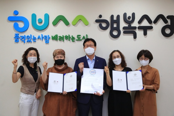 | ↑↑ 대구 수성구는 수성 글로벌 여성 아카데미 사업이 유네스코 한국위원회가 주관하는 ‘유네스코 지속가능발전교육(ESD) 공식 프로젝트 인증’을 획득한 후 관계자들이 인증서와 현판을 들고 기념촬영 하고 있다. |