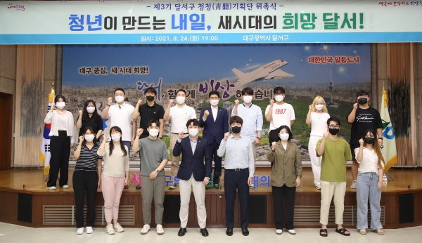 대구 달서구(구청장 이태훈)는 지난 24일 2층 대강당에서 지역청년들이 청년 문제를 직접 함께 고민하며 청년사업을 발굴․제안하는 소통창구로서의 역할을 하는 청년네트워크인 「제3기 달서구 청청기획단 위촉식」을 가졌다고 밝혔다.