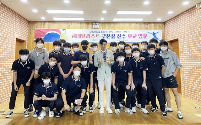 2020 도쿄올림픽 남자 펜싱 사브르 단체전에서 금메달을 따낸 구본길(국민체육진흥공단 소속)선수가 25일 오전 10시 모교인 오성중·고를 방문해 후배들을 만났다.