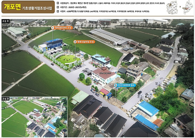 감천‧보문‧개포면은 기본 계획을 완료 했으며 각 사업지구별 40억 원을 투입해 건강나눔센터, 행복나눔마당 등을 2023년까지 설치하고 올해 선정된 유천면은 지역 주민들 의견을 수렴해 기본계획 수립 중에 있다.