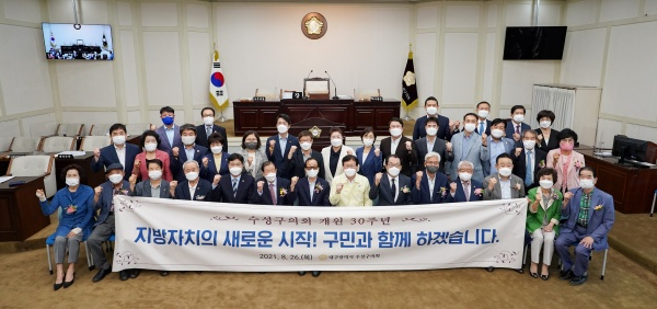 수성구의회(의장 조용성)는 26일 본회의장에서 수성구의회 개원 30주년을 맞이해 초대 의장 및 의정회 임원단을 초청해 본회의를 참관하고 30주년을 기념하는 뜻깊은 시간을 가졌다.