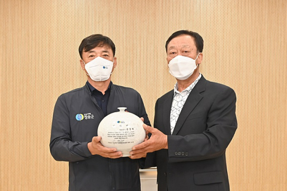 윤경희 청송군수가 농업인들의 농업경영 안정 및 지역경제 활성화, 주산천작목반 발전에 크게 기여한 공로를 인정받아 주산천작목반으로 부터 감사패를 받았다.