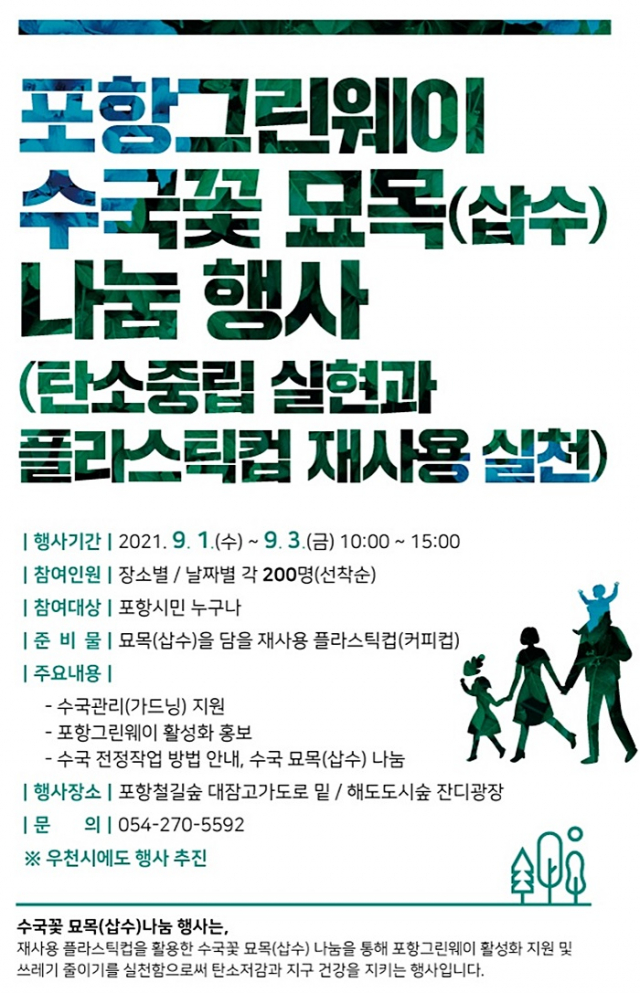 이번 행사는 9월 1일부터 3일까지 오전10시 ~ 오후3시까지 포항철길숲 대잠고가도로 아래와 해도 도시숲 잔디광장에서 일회용 재사용 플라스틱컵을 가져올 시 수국 묘목 삽수를 무료로 나눠주는 이벤트이다.