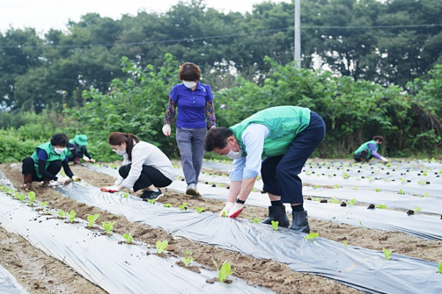 ‘사랑의 김장 담가주기’ 행사는 새마을 농장의 휴경지 밭을 이용해 새마을 회원들이 직접 배추 농사를 지어 매년 11월경 김장김치를 담가 지역 내 소외계층에 지원하는 활동으로, 이날 행사에서는 이른 아침부터 배추 모종 3,000여 개를 옮겨 심으며 구슬땀을 흘렸다.