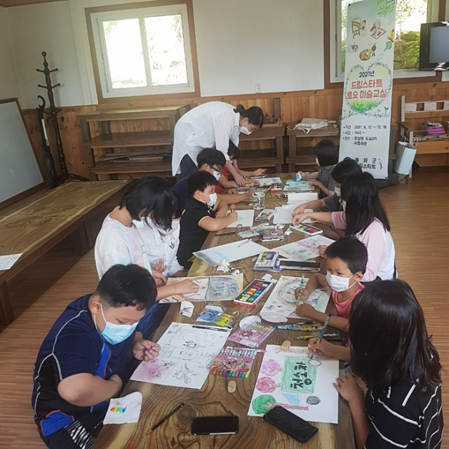 ‘토요미술교실’은 코로나19 및 지리적 위치로 인하여 문화․예술 체험에 소외된 농촌 벽지 아동들에게 창의력과 표현력을 향상시키고 지역 내 교류와 협력으로 자원을 연계하여 마을 돌봄 체계를 구축하는데 기여하는 프로그램이다.