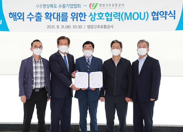 (사)경상북도 수출기업협회(회장 배영일)는 영양고추유통공사(사장 최현동)와 MOU체결을 통해 해외 홍보 자원을 통한 인프라 교류 및 협력과 수출관련 해외시장 정보 공유를 통해 상호간 주요 추진하는 사업에 상생 및 발전을 도모하기로 했다.