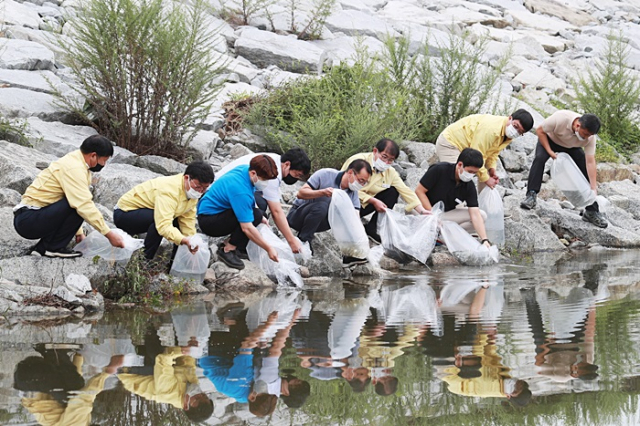 예천군(군수 김학동)은 2일 오전 11시 한천 등 12개 읍‧면 하천과 저수지에 붕어, 잉어, 메기 치어 10만 마리를 방류했다.