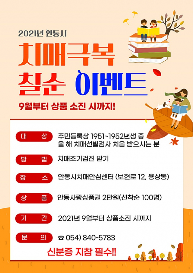 - 문의 : 안동시 치매안심센터(☎ 054-840-5783)/치매상담콜센터(☎1899-9988)