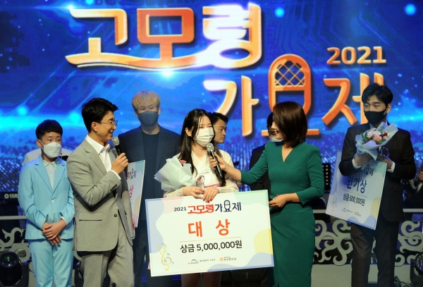 | ↑↑ 관중 없이 비대면으로 개최된 2021 고모령 가요제에서 장예주 씨가 대상을 수상한 후 소감을 전하고 있다. |