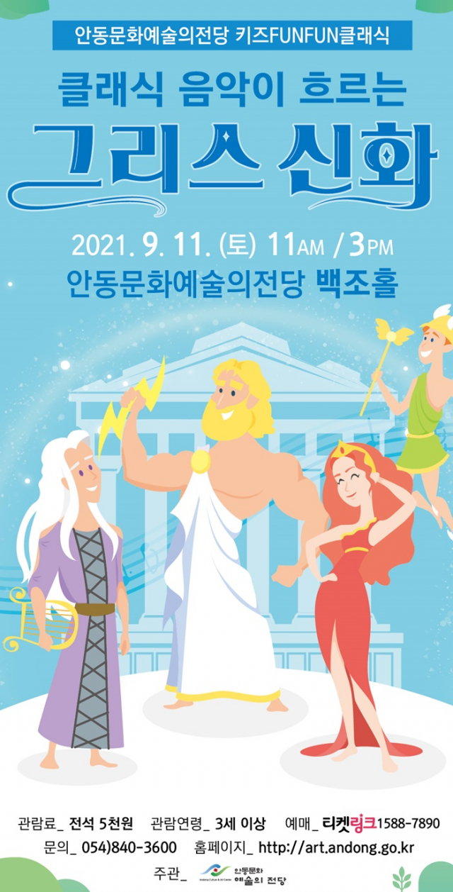 안동문화예술의전당 키즈FUNFUN클래식‘클래식 음악이 흐르는 그리스 신화’는 코로나19 사회적 거리두기 지침을 준수하여 진행된다. 관람료는 전석 오천 원으로 자세한 내용은 전화 840-3600번 또는 안동문화예술의전당 홈페이지(Http://art.andong.go.kr)로 확인할 수 있다.