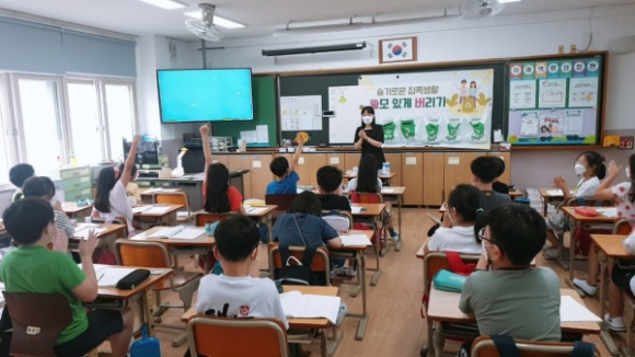 | ↑↑ 수성글로벌ESD실천연대가 지난 8월 29일 신매초등학교 학생을 대상으로 ‘슬기로운 집콕생활! 쓸모있게 버리기’ 환경 교육을 진행하고 있다. |