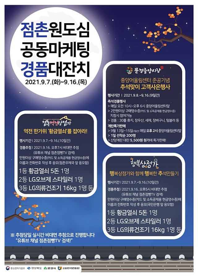 점촌역전상점가는 ‘역전 한가위 황금열쇠를 잡아라!’, 행복상점가는 ‘행복상점가와 함께 행복한 추석만들기’라는 주제로 9월 7일부터 16일까지 10일간 행사를 진행한다. 중앙시장과는 달리 1만원이상 구매고객들은 카드(현금)영수증에 이름과 연락처를 작성해 경품행사에 응모할 수 있으며, 황금열쇠 5돈을 비롯해 LG오브제 스타일러, 의류건조기 등 각종 경품을 준비했다.