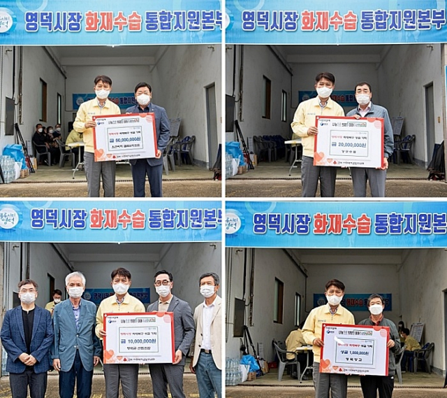 오션비치 골프리조트(대표 조재관)에서 5,000만원, 강구수협 협동조합(조합장 강신국) 2,000만원, 도화엔지니어링(회장 김영윤) 2,000만원, 영덕군 산림조합(조합장 권오웅) 1,000만원, 우림산업(대표 이대희) 200만원, 미래환경산업(대표 박기복), 영덕향교(전교 신성수), 영덕군 여성단체협의회(회장 신정희), 영해만세시장 상인회(회장 장시덕), 영덕군 지속가능발전 협의회(회장 박홍), 영덕군의사회(회장 이규종). 화개장터 상인회(회장 김유열), 영덕군 홍보대사(개그맨 손헌수) 모두 100만원을 영덕시장 화재복구를 위한 성금으로 기탁했다.