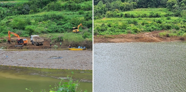 | ↑↑ 경북 중부지역 집중호우로 군위댐에 유입된 부유물 쓰레기 약 2,400㎥을 수거하였다. 수거전, 후 사진 |