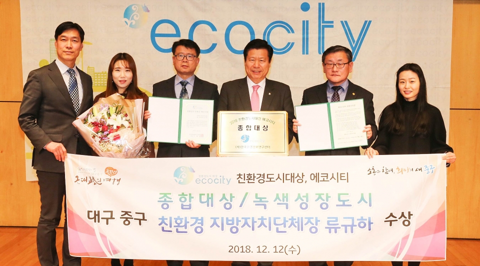 대구 중구(구청장 류규하)는 지난 12일 오후 1시 (사)한국환경정보연구센터가 주최한 ‘제7회 대한민국 친환경도시대상, 에코시티’에서 녹색성장도시 종합 대상 및 친환경 지방자치단체장상을 수상했다.