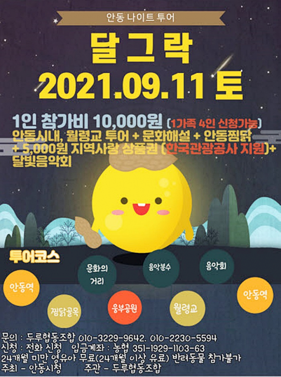경상북도와 안동시가 주최하고, 두루협동조합이 주관하는 안동달빛투어 ‘달그락(樂)’이 오는 11일(토)부터 시작하여 9/25, 10/9, 10/23, 11/6 총 5회에 걸쳐 진행된다.