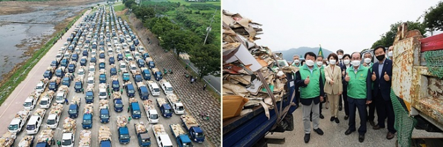 | ↑↑ 폐자원을 가득 실은 트럭이 청도천 둔치를 메웠다. 한정애 환경부장관 외 내빈들과 자원순환운동의 의미를 더했다. |