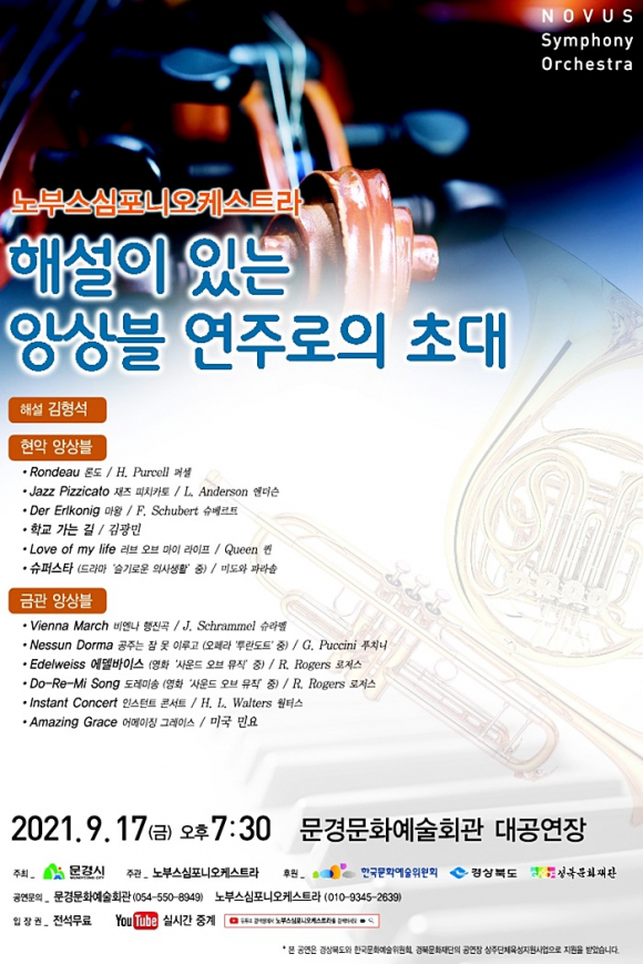 문경문화예술회관은 가을 향기가 짙어가는 오는 9월 17일 오후7시30분에 대공연장에서 쉽고 편안한 음악을 들려주기 위해 많은 활동을 하고 있는 노부스심포니오케스트라(상임지휘자 김형석) 연주회를 갖는다.