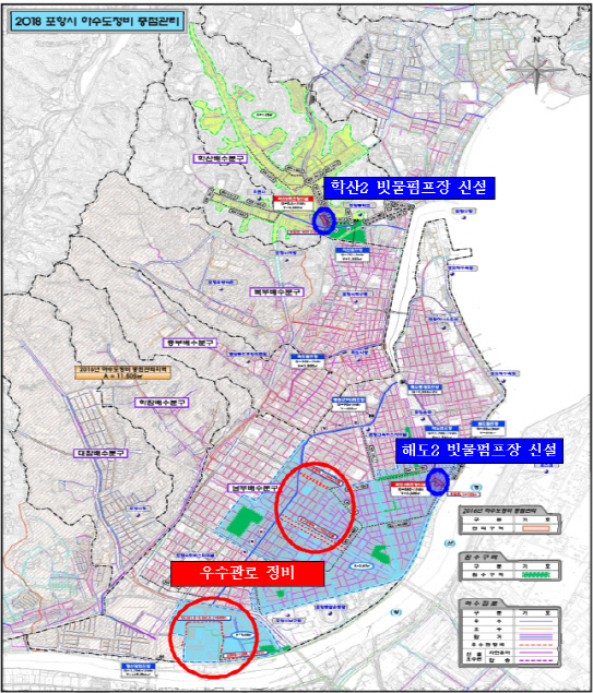 포항시는 지난 2015년에도 하수도정비 중점관리지역으로 선정되어 2019년 12월 완공계획으로 315억의 사업을 투입해 죽도동, 용흥동 일대의 침수예방사업을 추진하고 있으며 지난 태풍 ‘콩레이’ 내습 시 침수를 막으며 사업효과를 입증한 바 있다.