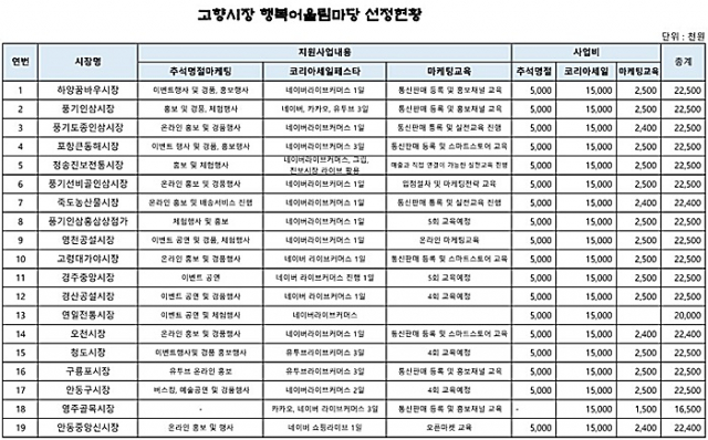 경상북도는 경북 경제진흥원과 전통시장 상품 판로확대 및 지역경기 활성화를 위한‘2021년 고향시장 행복어울림마당’공모해 지역 19개 전통시장을 최종 선정했다고 10일 밝혔다.