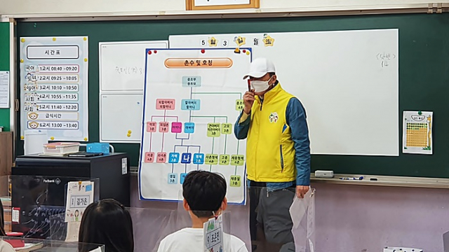 | ↑↑ 대진초 4학년교실에서 어르신이 학생들에게 촌수에 대해서 알려주는 모습 |