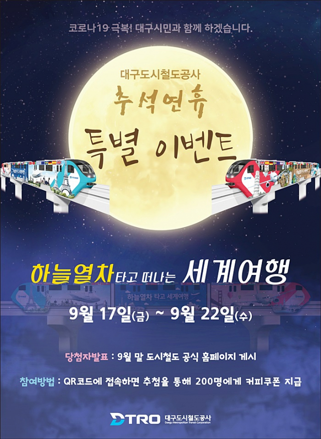 추석연휴 기간(17일~22일) 동안 세계테마열차를 이용하는 시민들을 대상으로 깜짝 이벤트도 진행한다. 열차내에 부착된 QR코드로 응모를 하면 운행종료 후 추첨을 통해 200명에게 모바일 커피 쿠폰을 증정한다.