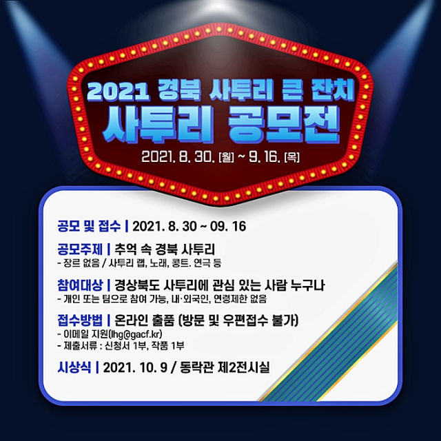 사투리 경연대회는 경북의 사투리로 구성된 연극, 콩트, 노래 등 다양한 장르로 9월 30일까지 참여 신청 가능하며 경북 사투리에 관심 있는 누구나 참여할 수 있다.